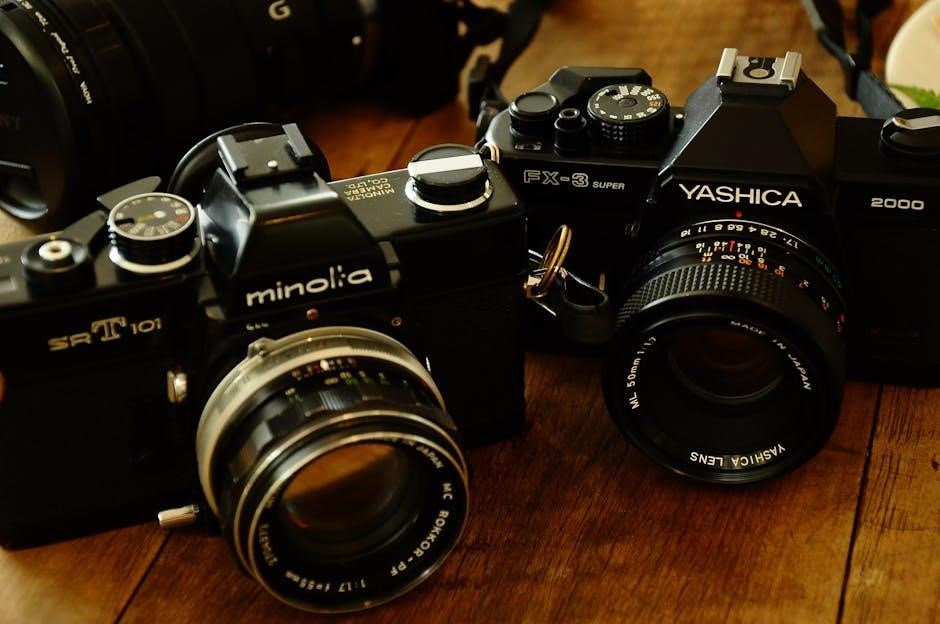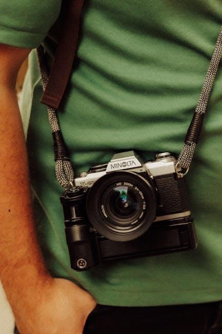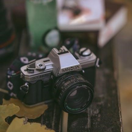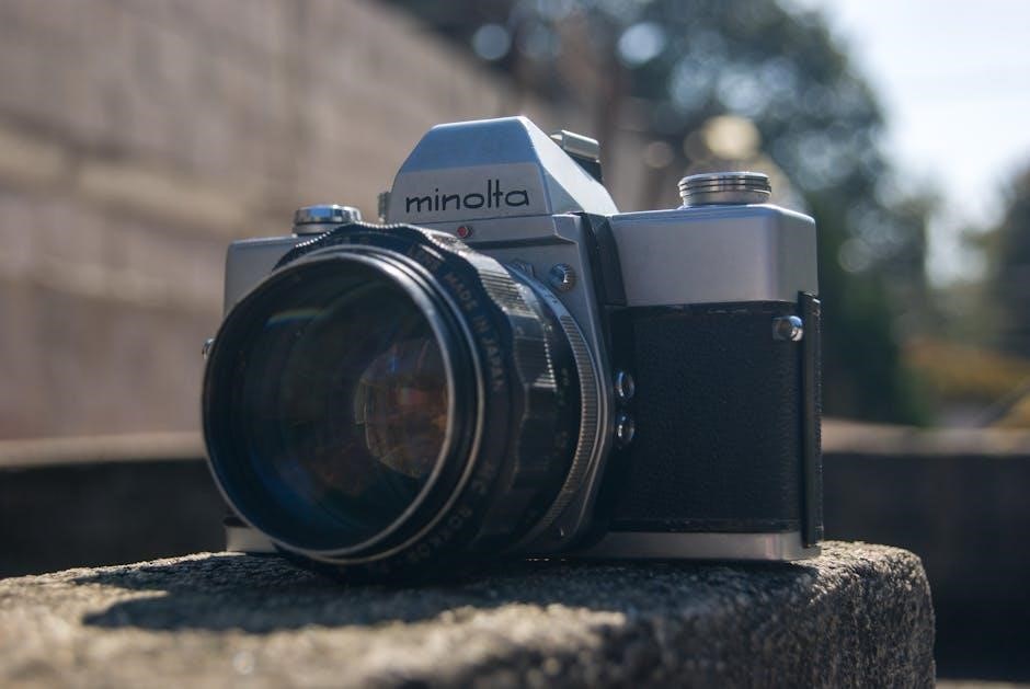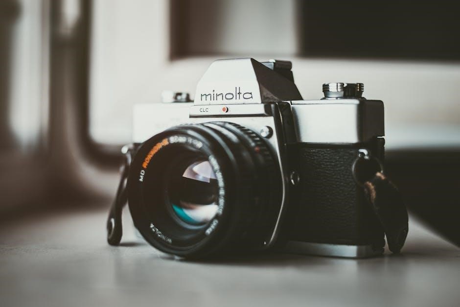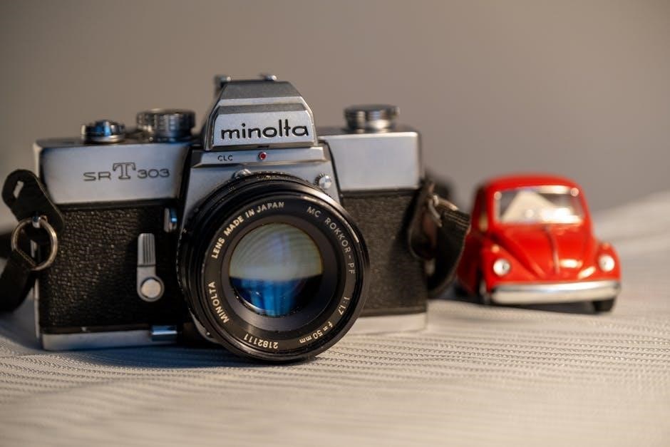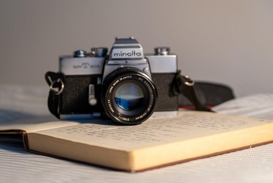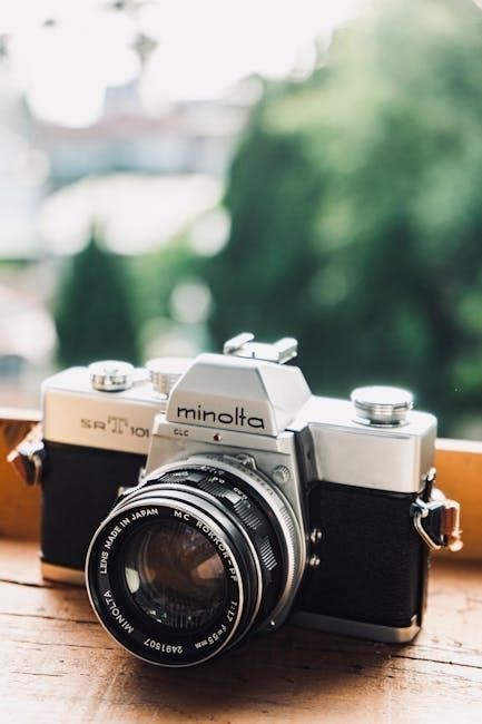 The Minolta SRT 201 manual is a comprehensive guide for mastering this classic SLR camera. Available online in PDF format, it covers essential topics like film loading, focusing techniques, and exposure control, ensuring optimal use of the camera’s capabilities. This manual is indispensable for photographers seeking to unlock the full potential of their Minolta SRT 201.